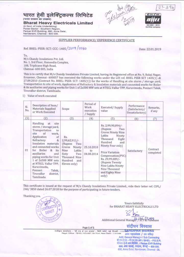 CIPL successfully completed the application of refractory and insulation materials for the boiler and piping units of BHEL