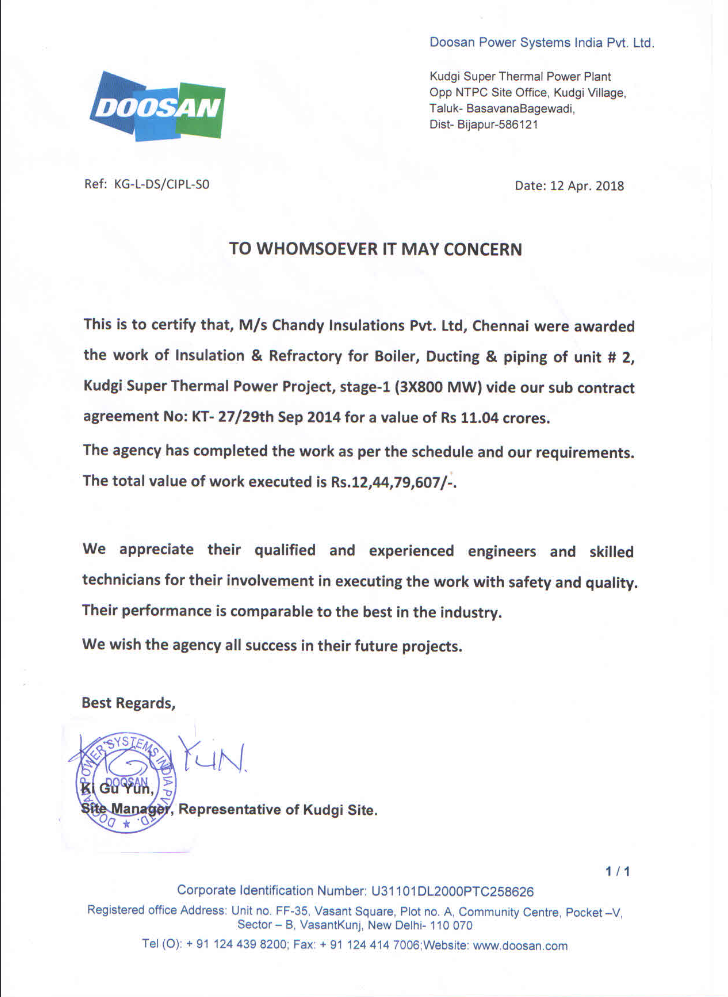 CIPL performed insulation and refractory work for the boiler, piping, and ducting units of Doosan Power Systems Pvt Ltd.